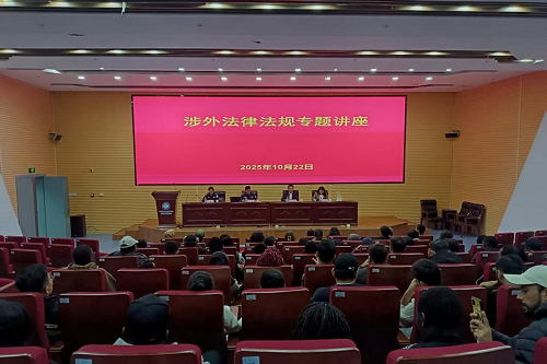 为切实提升来华留学生在华法律意识,了解涉外法律法规知识,2025年10月22日,国际学院邀请淮南市公安局出入境管理局,在国家重点实验室一楼学术报告厅举办涉外法律法规专题讲座。本次活动由国际学院院长王宗华主持,淮南市公安局出入境管理局局长梁育荣、大队长王姗姗出席,各学院留学生秘书及全体在校留学生参加。