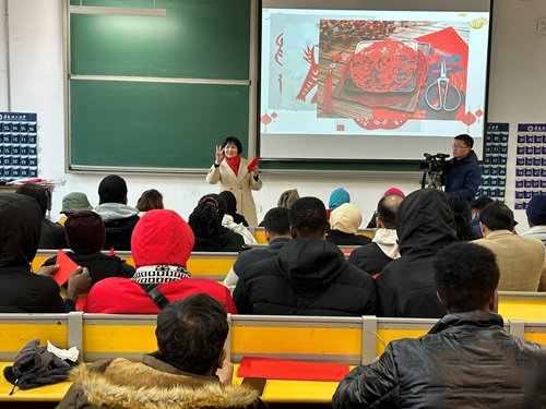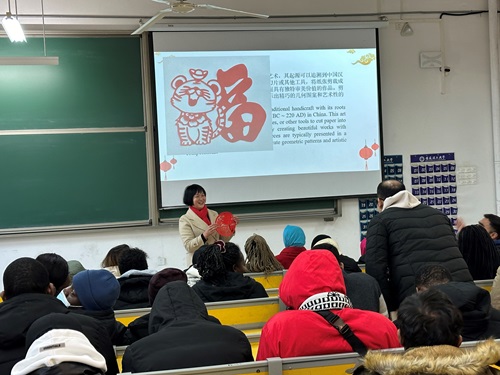 为使留学生进一步感知中国传统文化,体验中国文化之美,1月24日下午,在明理北102教室国际学院特邀安徽省工艺美术大师、淮南市“非遗”剪纸项目代表性传承人周琴来校为留学生开展中国“非遗”剪纸艺术学术讲座。讲座由国际学院院长王宗华主持。