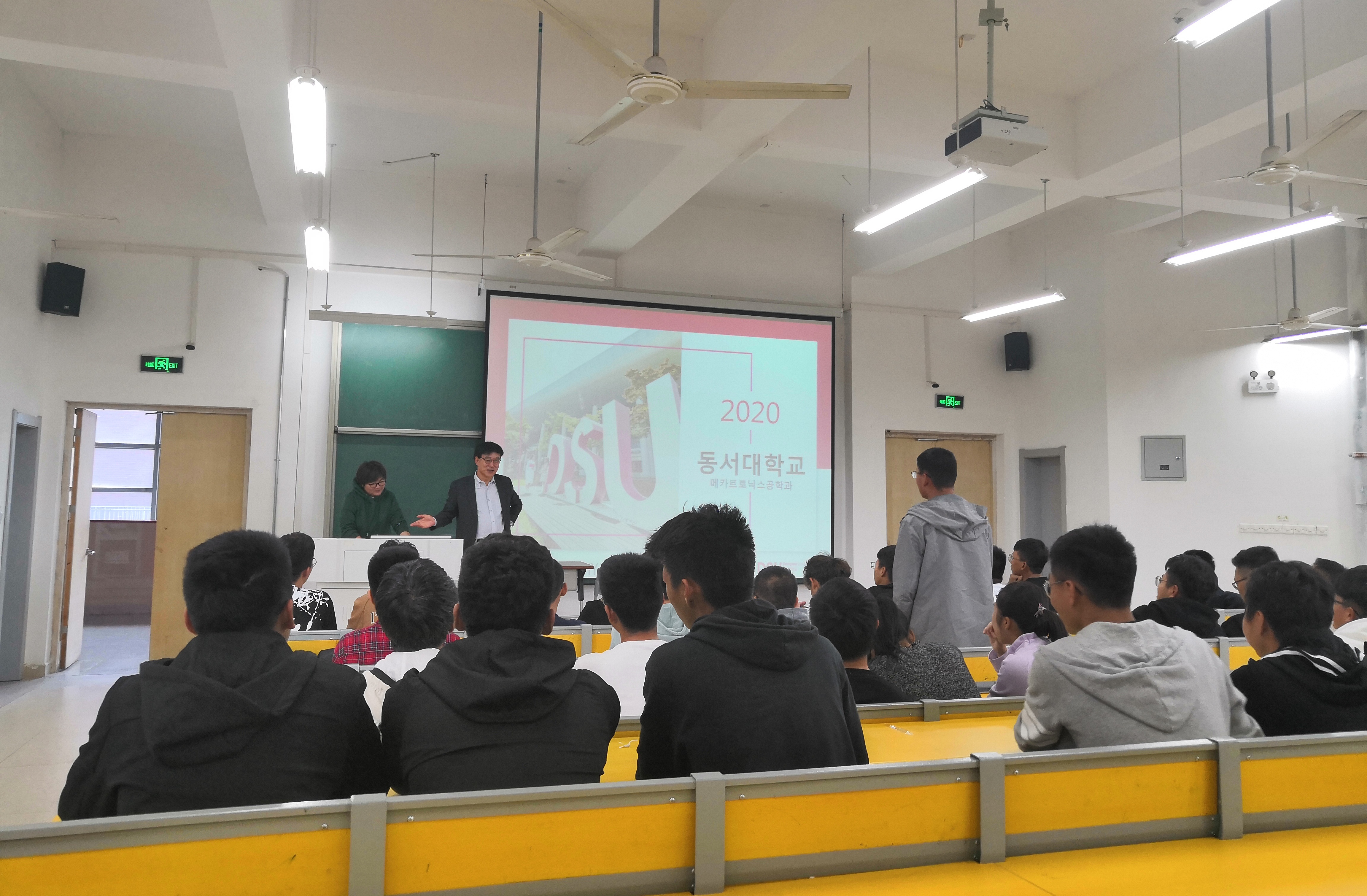 会谈结束后,韩京镐一行参观了机械工程学院部分实验室和我校图书馆,并与我校2018及2019级机械电子中外合作办学专业学生在天工205教室进行了座谈。朴修弘详细介绍了东西大学机械电子融合工程学部软硬件设施等相关情况,并就学生关心的问题进行了详细的解答。