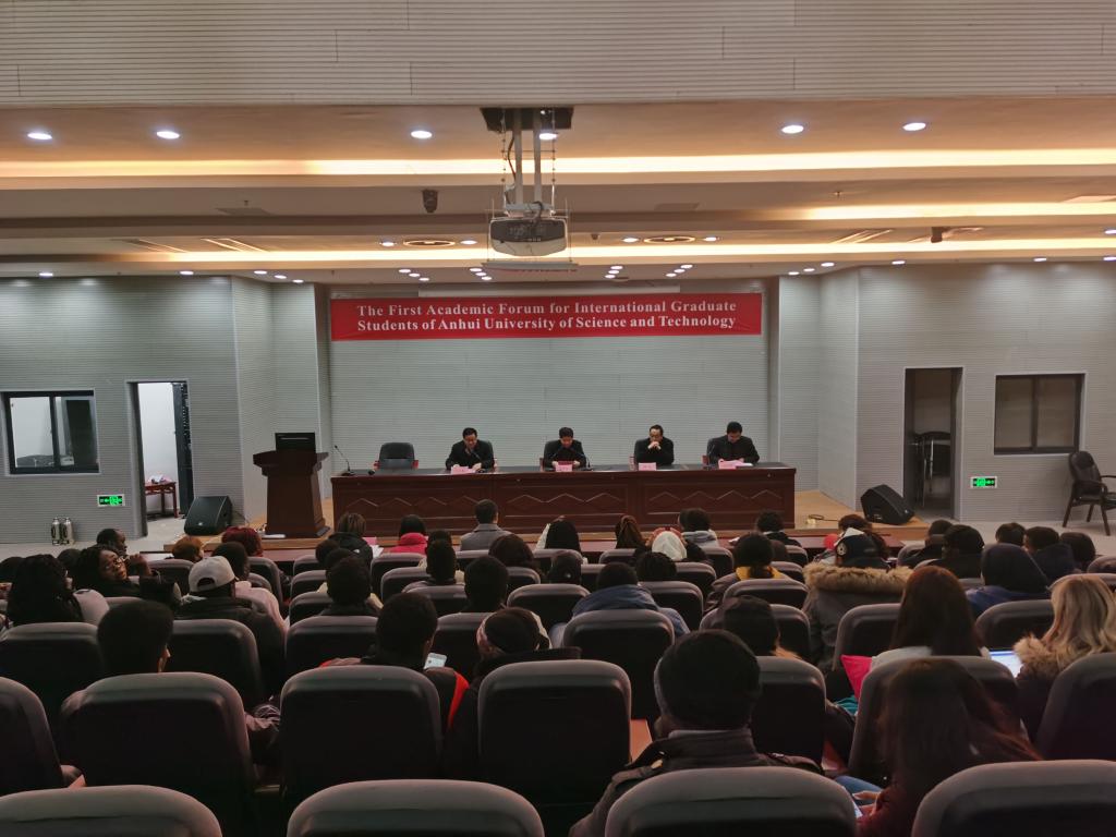 2019年12月30日下午,由国际学院主办的安徽理工大学第一届留学研究生学术论坛在校图书馆会议室召开,副校长孟祥瑞教授出席开幕式并致辞,论坛邀请了国家级人才薛生教授和地环学院武慧君博士做学术报告,邀请李宁博士、杜宇博士和武慧君博士担任点评专家,2018级和2019级全体留学研究生参加此次学术论坛。论坛由国际学院院长马芹永教授主持。