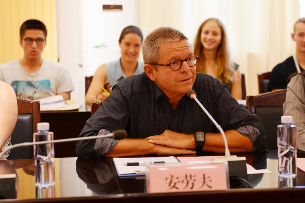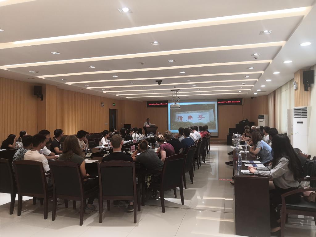 开幕式后,我校楚淮文化研究中心副教授、《淮南子》与道家道教研究所所长高旭为中德学子作了题为《The Huainanzi and the Chinese Taoist Wisdom》的特色文化讲座。高旭向中德学子介绍了“共工触山”、“女娲补天”、“后羿射日”、“嫦娥奔月”中国古代著名的四大神话,并从校园道路命名、八公山淮南鸿烈雕塑等方面深入浅出地介绍了《淮南子》中蕴含的中华文化精神。